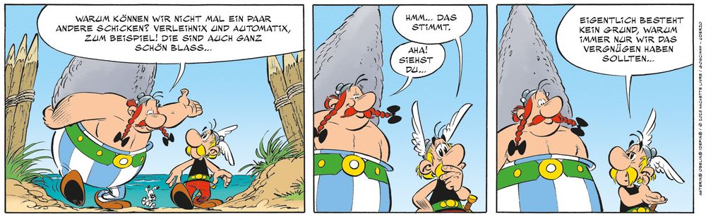 Für Gelegenheitsleser ist der Band ein leichter Einstieg, der keine jahrelange Kenntnis der handelnden Personen und ihrer bereits erlebten Abenteuer voraussetzt. Wir erleben die Gallier in einem frischen Umfeld, dass – im Gegensatz zu Goscinny’s Skripten – in manchen Augenblicken etwas überfrachtet daher kommt. Klischees sind schön, sollten aber nicht zum Selbstzweck werden und in erster Linie der Handlung dienen.