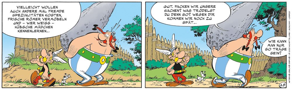 Die Kombination Fabcaro / Conrad / Mebarki ist ein Team, das authentisch mit dem Stoff umgeht, aber auch subtile Veränderungen einbringt. Fabcaro spielt erzählerisch mit vertrauten Zutaten (Zaubertrank, Prügeleien, Römer in Hülle und Fülle, Gallier, die sich wehren), hat aber auch einen modernen Blick auf aktuelle Themen und geht subtil darauf ein. Conrad und Mebarki wiederum liefern die vertraute visuelle Sprache dazu, auch wenn Conrad’s Figuren abgerundeter erscheinen als noch bei Übervater Uderzo.